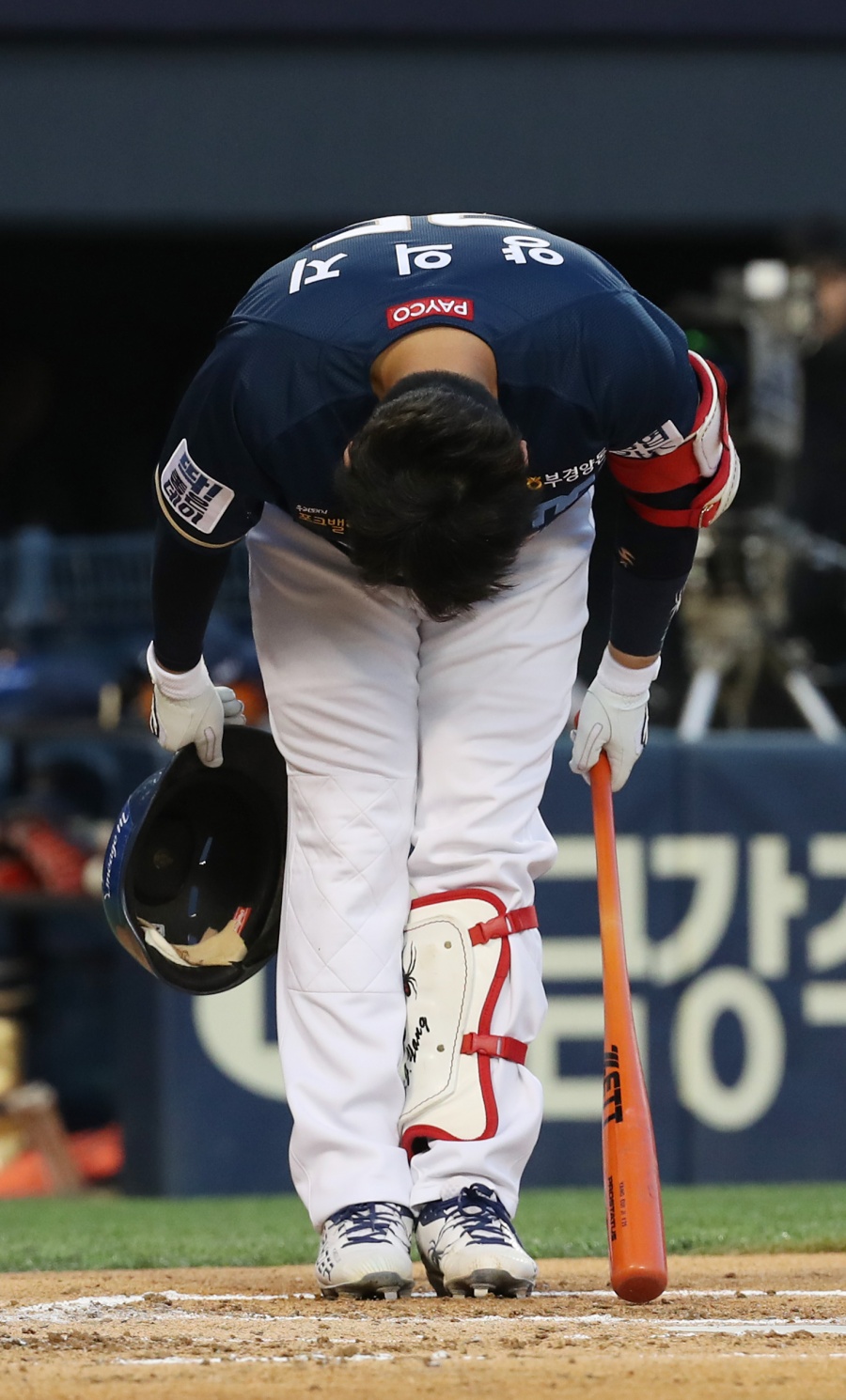 NC가 1-0으로 앞선 2회 선두 타자로 첫 타석에 들어선 양의지는 3차례 고개를 숙였다. 가장 먼저 1루를 향해 인사했다. 2006년 두산에 입단했을 때부터 지난해까지 아낌없는 사랑을 준 팬들에게 그동안 감사했다는 뜻이 담겨 있었다. 홈플레이트 뒤를 바라보고 한번 더 인사한 양의지는 마지막으로 그라운드를 바라보고 고개를 숙였다. 12년 동안 함께한 동료들을 향한 인사였다.