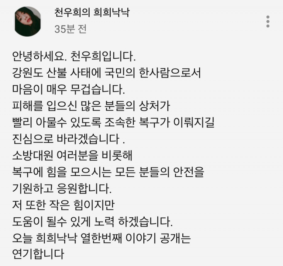 천우희는 6일 자신의 유튜브 계정을 통해 "강원도 산불 사태에 국민의 한 사람으로서 마음이 매우 무겁습니다. 피해를 입으신 많은 분들의 상처가 빨리 아물 수 있도록 조속한 복구가 이뤄지길 진심으로 바라겠습니다"라고 밝혔다.