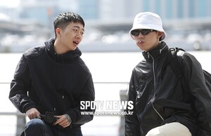 [스포티비뉴스=인천국제공항, 곽혜미 기자] SPOTV에서 제작하는 영국 여행 리얼리티와 챔피언스리그 관람 촬영 차 래퍼 사이먼 도미닉(쌈디), 우원재, 코드쿤스트가 7일 오전 인천국제공항을 통해 영국으로 출국했다. 우원재, 코드쿤스트가 신호를 기다리며 대화를 나누고 있다.