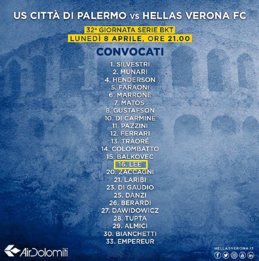 엘라스 베로나는 7일(이하 한국 시간) SNS에 2018-19시즌 이탈리아 세리에B 32라운드 팔레르모전 소집명단을 공개했다.