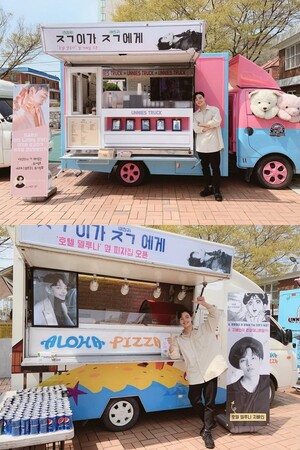 진구는 여러 장에 걸쳐 정국이 보낸 간식차를 인증했다. 진구가 공개한 사진에는 정국이 보낸 간식차 앞에서 진구가 미소를 짓고 있는가 하면, “호텔 델루나 응원하겠습니다. 진구 친구 정국”이라는 정국의 메시지가 적혀있는 스티커가 담겨 있다.