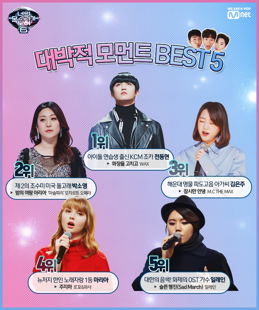 5회 박정현, 거미 편에 출연해 경이로운 목소리가 무엇인지 알려준 소프라노 박소영은 '밤의 여왕 아리아'로 환상적인 무대를 선사했다. 세계 3대 오페라 극장에서만 들을 수 있는 그녀의 파워풀한 목소리는 52만 동영상 조회 수를 기록하며 두고두고 볼 정도로 폭발적인 반응을 얻고 있다.