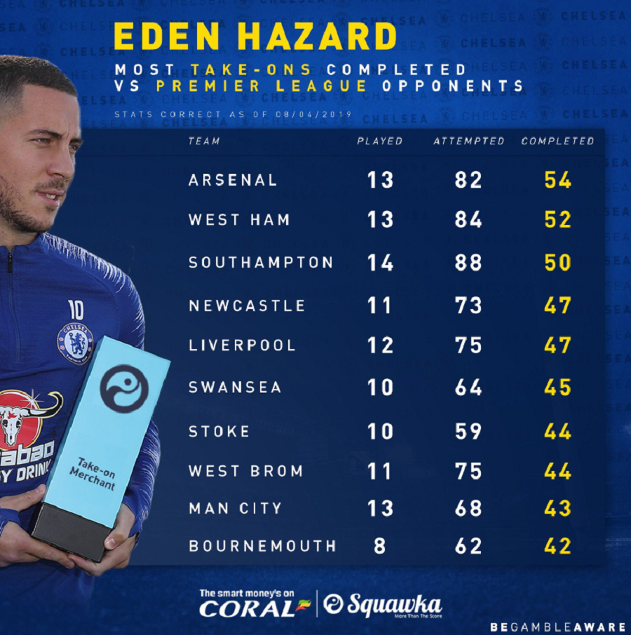'스쿼카풋볼' 9일(이하 한국 시간) EPL 기준 아자르의 드리블 돌파 시도와 성공 횟수를 공개했다. 아자르는 아스널전 13경기에서 82번의 드리블을 시도해 54번을 성공했다. 아자르에게 가장 많이 괴롭힘을 당한 팀인 셈이다.