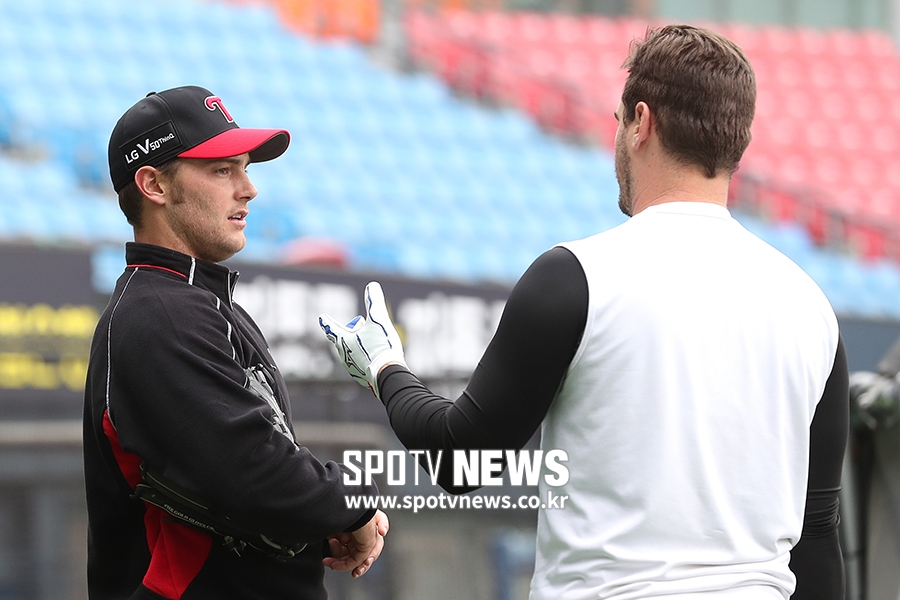 [스포티비뉴스=잠실, 곽혜미 기자] 2019 신한은행 MY CAR KBO리그 LG 트윈스와 삼성 라이온즈의 경기가 9일 오후 서울 잠실야구장에서 열린다. LG 윌슨과 조셉이 대화를 나누고 있다.