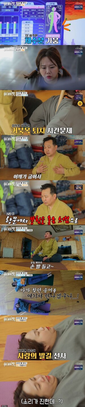 먼저 이들은 원장이 진행하는 요가 수업을 받게 됐다. 원장은 다소 요상한 방식의 호흡법을 추천해 넉살 좋은 홍현희조차 웃음보가 터져 따라할 수 없게 만들었다. 이후 추천한 물고기 운동과 장 마사지를 하다 홍현희는 방귀를 크게 뀌었고 이 모습에 모두가 함께 폭소했다.