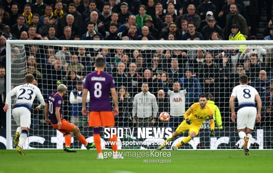 기회도 있었다. 12분 대니 로즈가 핸드볼 파울을 범했다. 세상 냉정했던 주심은 토트넘 팬들의 야유에 굴하지 않고 비디오 판독(VAR)을 통해 페널티킥을 선언했다. 키커로 세르히오 아구에로가 나섰다. 리그에서 19골을 넣으며 선두를 달리고 있던 아구에로였다. 그러나 위고 요리스 골키퍼에게 킥 방향이 읽혔고 막혔다. 팬들은 환호와 함께 주심과 맨시티에 다시 야유를 보냈다.