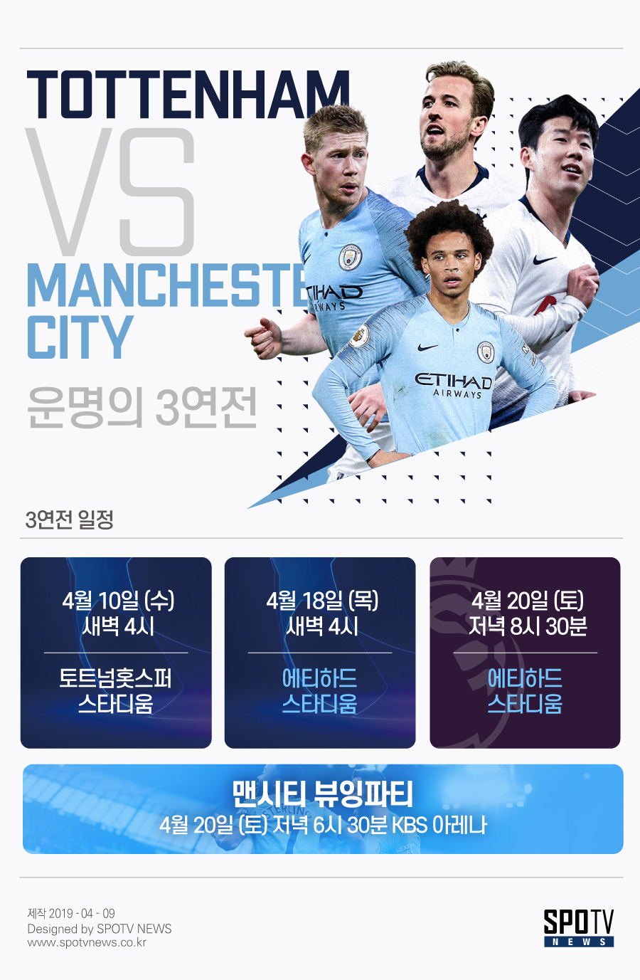 토트넘은 10일 오전 4시(한국 시간) 영국 런던의 뉴화이트하트레인에서 열린 2018-19시즌 유럽축구연맹(UEFA) 챔피언스리그 8강 1차전 맨체스터시티와 홈경기에서 1-0으로 이겼다. 후반 32분 손흥민의 결승 골이 터졌다.