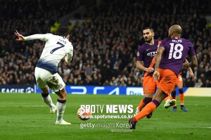 토트넘은 10일 오전 4시(한국 시간) 영국 런던의 뉴화이트하트레인에서 열린 2018-19시즌 유럽축구연맹(UEFA) 챔피언스리그 8강 1차전 맨체스터 시티와 홈경기에서 1-0으로 이겼다. 후반 33분 손흥민의 결승 골이 터졌다.