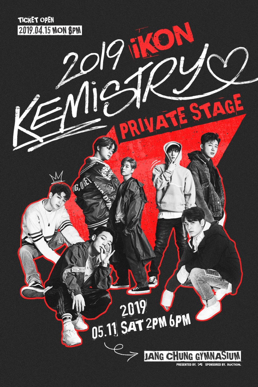 아이콘 소속사 YG엔터테인먼트는 10일 공식 SNS에 아이콘 2019 프라이빗 스테이지 '케미스트리(KEMiSTRY)'포스터 공개와 함께 프라이빗 스테이지가 다음달 11일 오후 2시, 오후 6시 모두 2회에 걸쳐 서울 중구 장충체육관에서 개최된다고 밝혔다.