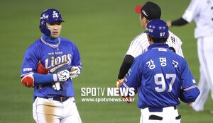 [스포티비뉴스=잠실, 곽혜미 기자] 2019 신한은행 MY CAR KBO리그 LG 트윈스와 삼성 라이온즈의 경기가 11일 오후 서울 잠실야구장에서 열린다. 5회초 2사 2루 상황에서 삼성 박해민이 역전 적시타를 친 후 숨을 고르고 있다.