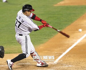 [스포티비뉴스=잠실, 곽혜미 기자] 2019 신한은행 MY CAR KBO리그 LG 트윈스와 삼성 라이온즈의 경기가 11일 오후 서울 잠실야구장에서 열린다. 5회말 1사 2루 상황에서 LG 유강남이 동점 적시타를 날리고 있다 .