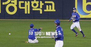 [스포티비뉴스=잠실, 곽혜미 기자] 2019 신한은행 MY CAR KBO리그 LG 트윈스와 삼성 라이온즈의 경기가 11일 오후 서울 잠실야구장에서 열린다. 5회말 2사 1루 상황에서 LG 이천웅의 타구를 삼성 이학주와 박해민이 놓치고 있다.