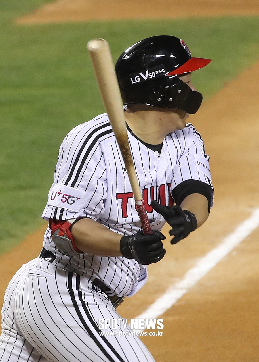 [스포티비뉴스=잠실, 곽혜미 기자] 2019 신한은행 MY CAR KBO리그 LG 트윈스와 삼성 라이온즈의 경기가 11일 오후 서울 잠실야구장에서 열린다. 7회말 1사 1,3루 상황에서 LG 김현수가 적시타를 날리고 있다.