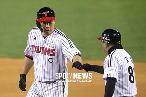 [스포티비뉴스=잠실, 곽혜미 기자] 2019 신한은행 MY CAR KBO리그 LG 트윈스와 삼성 라이온즈의 경기가 11일 오후 서울 잠실야구장에서 열린다. 7회말 1사 1,3루 상황에서 LG 김현수가 적시타를 날리고 코치와 기쁨을 나누고 있다.