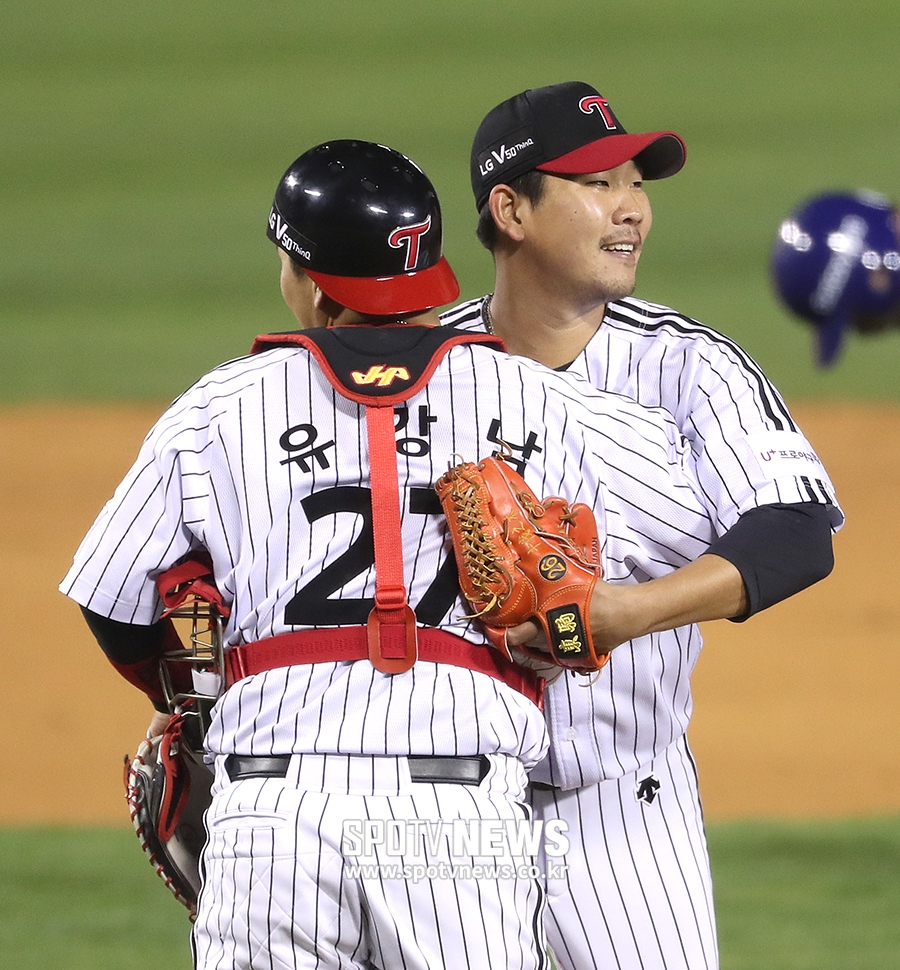 [스포티비뉴스=잠실, 곽혜미 기자] 2019 신한은행 MY CAR KBO리그 LG 트윈스와 삼성 라이온즈의 경기가 11일 오후 서울 잠실야구장에서 열린다. 5-2로 승리한 LG 유강남과 정찬헌이 승리의 포옹을 나누고 있다.