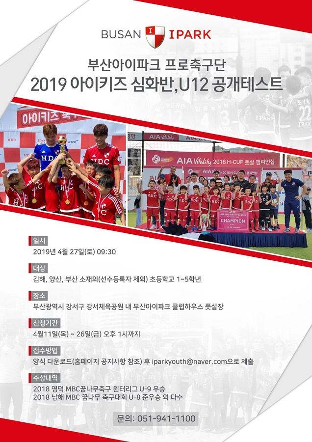 심화반 공개테스트 참가 접수는 10일부터 구단 홈페이지에서 신청 양식을 다운로드 후 오는 4월 25일(목) 오후 3시까지 이메일(iparkyouth@naver.com)로 접수하면 된다.