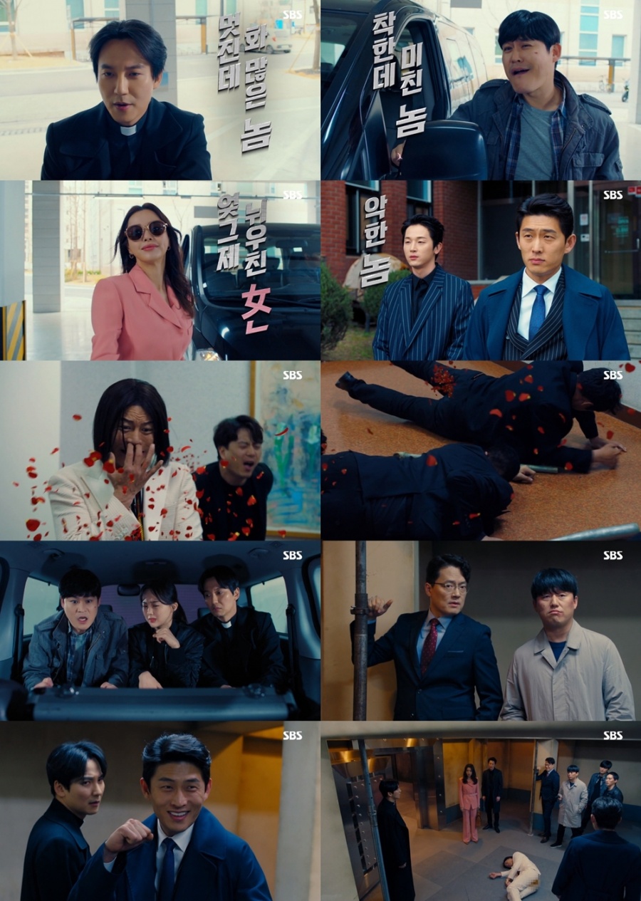 SBS 금토드라마 ‘열혈사제’(극본 박재범, 연출 이명우, 제작 삼화네트웍스)가 명장면 퍼레이드를 이어갔다. 12일 방송된 ‘열혈사제’ 33, 34회에서도 시청자들을 제대로 웃긴 레전드 장면이 만들어졌다. 영화 ‘놈놈놈’과 ‘킹스맨’을 떠올리게 하는 ‘열혈사제’표 패러디가 안방극장에 웃음 핵폭탄을 선사한 것.