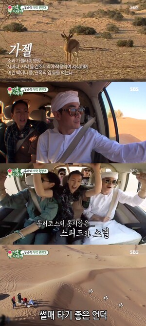 이들은 사막을 달리며 가젤, 오릭스 등을 코앞에서 보며 즐거워했고 배정남은 연신 한국어로 말을 걸었다. 쉽게 볼 수 없는 사막 동물뿐만 아니라 광활한 사막은 감탄 그자체였다.