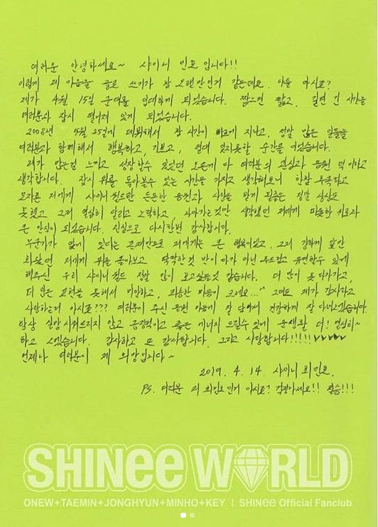 민호는 입대 하루 전인 14일 자신의 인스타그램에 직접 쓴 편지와 머리를 짧게 깎은 셀프 카메라를 게재하고 팬들을 향한 메시지를 전했다.