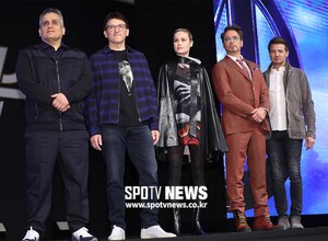 [스포티비뉴스=서울, 곽혜미 기자] 영화 ‘어벤져스:엔드게임’ 아시아 프레스 컨퍼런스가 15일 오전 서울 광화문 포시즌스호텔에서 열렸다. 조 루소, 안소니 루소 감독, 브리 라슨, 로버트 다우니 주니어, 제레미 레너(왼쪽부터)가 포즈를 취하고 있다.
