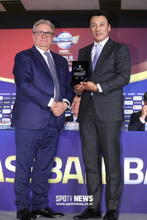 [스포티비뉴스=서울, 곽혜미 기자] 2019 WBSC 프리미어12 서울 예선라운드 기자회견이 15일 오후 서울 중구 소공동 웨스틴조선호텔에서 열렸다. 홍보대사로 위촉된 이승엽이 리카르도 프라카리 WBSC 회장과 기념 촬영을 하고 있다.