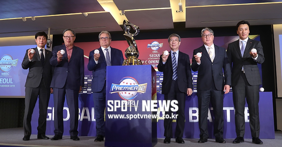 [스포티비뉴스=서울, 곽혜미 기자] 2019 WBSC 프리미어12 서울 예선라운드 기자회견이 15일 오후 서울 중구 소공동 웨스틴조선호텔에서 열렸다. 류대환 KBO 사무총장, 김응용 KBSA 회장, 리카르도 프라카리 WBSC 회장, 정운찬 KBO 커미셔너, 김경문 국가대표팀 감독, 이승엽 홍보대사(왼쪽부터)가 포즈를 취하고 있다.