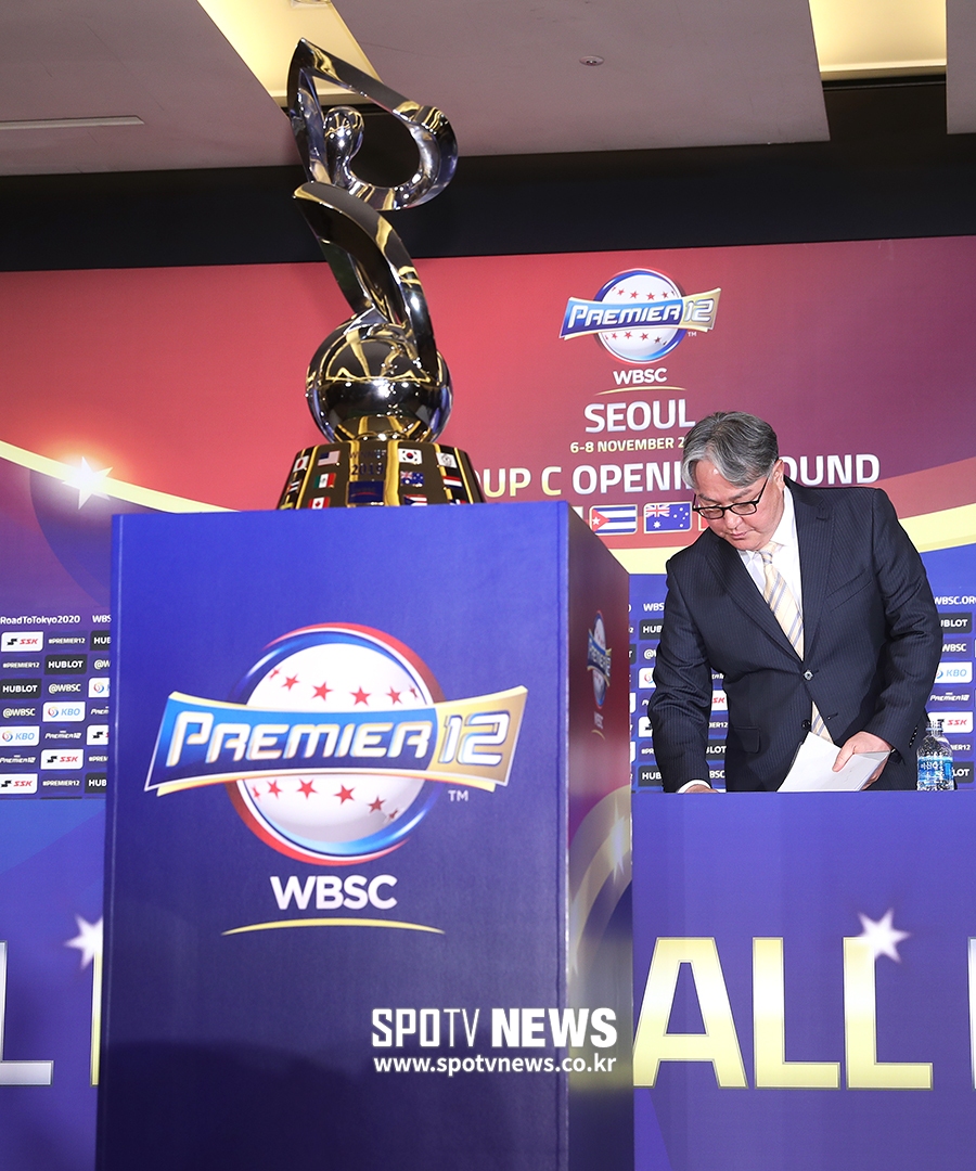 [스포티비뉴스=서울, 곽혜미 기자] 2019 WBSC 프리미어12 서울 예선라운드 기자회견이 15일 오후 서울 중구 소공동 웨스틴조선호텔에서 열렸다. 김경문 감독이 퇴장 준비를 하고 있다.