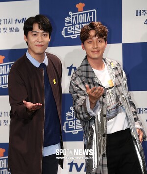 [스포티비뉴스=서울, 한희재 기자] tvN 예능 프로그램 ‘현지에서 먹힐까? : 미국편’ 제작발표회가 16일 오후 서울 여의도 켄싱턴호텔에서 열렸다. 가수 존박과 개그맨 허경환이 사진 촬영을 위해 포즈를 취하고 있다.