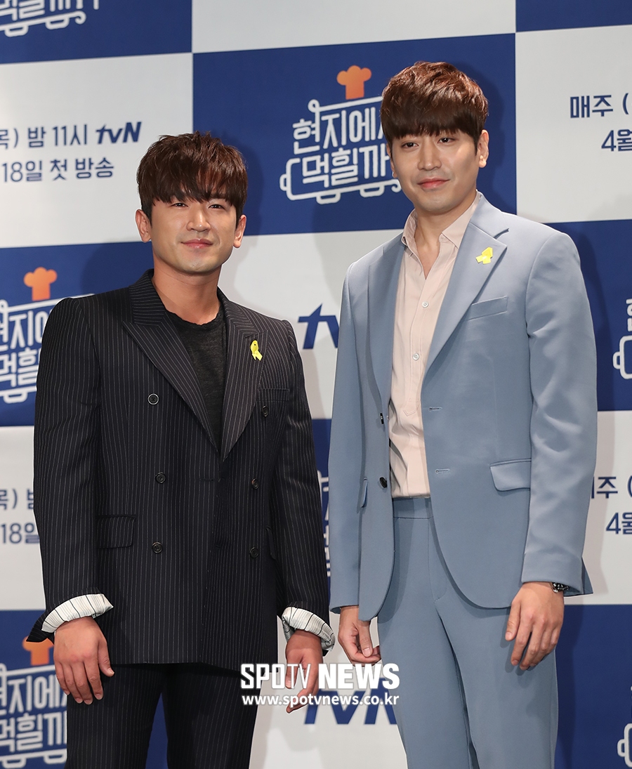 [스포티비뉴스=서울, 한희재 기자] tvN 예능 프로그램 ‘현지에서 먹힐까? : 미국편’ 제작발표회가 16일 오후 서울 여의도 켄싱턴호텔에서 열렸다. 신화 이민우와 에릭이 사진 촬영을 위해 포즈를 취하고 있다.