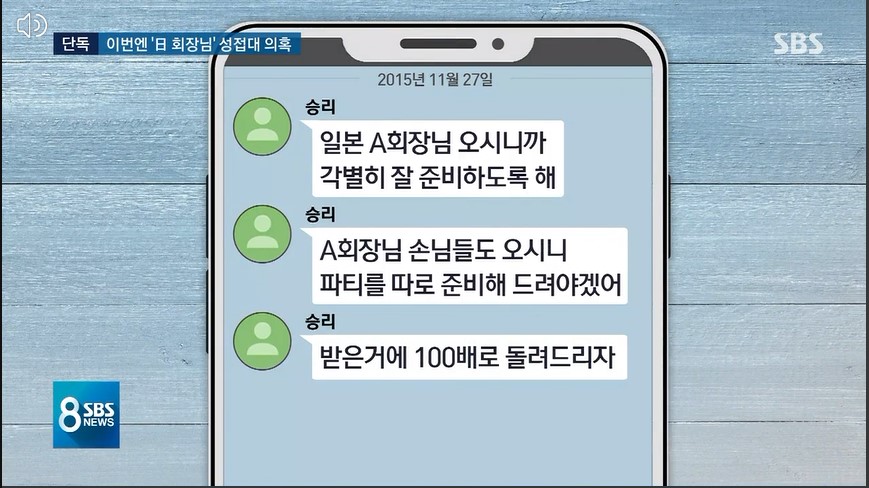 보도에 따르면 승리는 "'A 회장님'이 오시니 각별히 잘 준비하도록 해라" "A 회장님에게 받은 것 100배로 돌려 드리자"면서 극진한 대접을 준비하자는 말을 한다. 유인석 대표도 '일본 분들'이라 표현하며 한국을 또 찾고 싶을 정도로 잘 대접하자며 "클럽에 여자가 하나도 없을 정도로 아는 여자를 다 부르자"는 말을 한다.