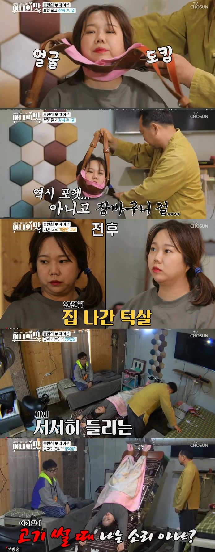먼저 단식원장은 홍현희의 이중턱을 가리키며 "턱선을 완전히 다듬어 주겠다"라며 홍현희의 턱에 기구를 채우고 목현수와 발현수 기구 체험을 시켜줬다.