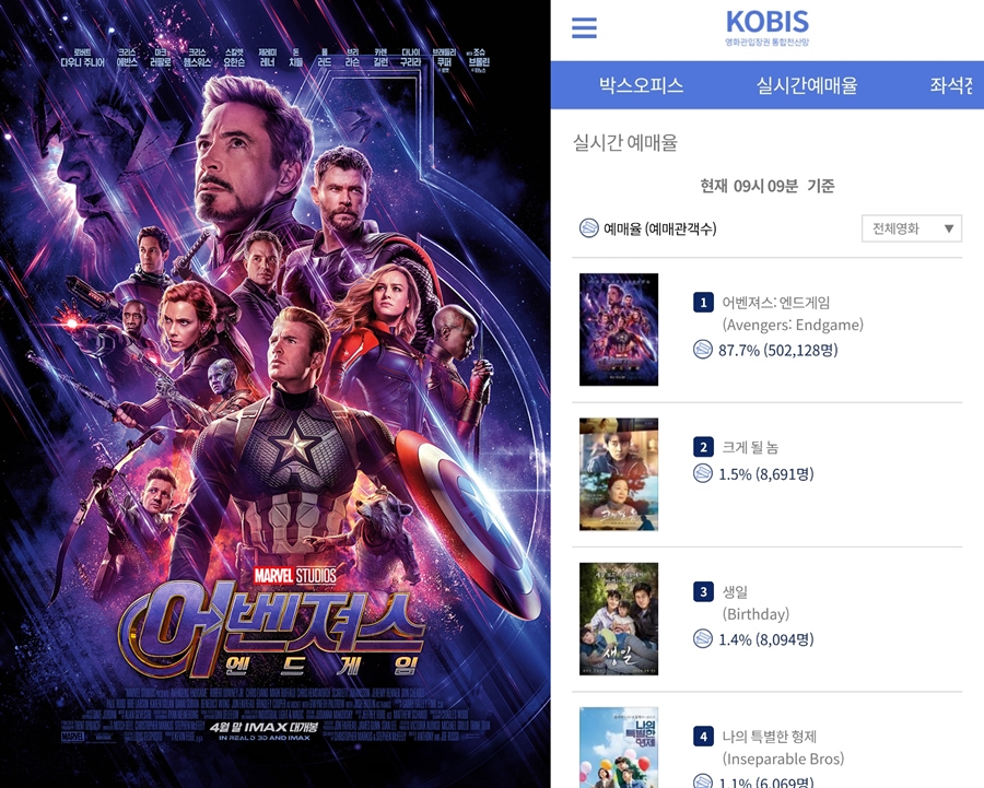 16일 오후 6시를 기해 '어벤져스:엔드게임' 2D 일반관 예매가 시작된 가운데 영화진흥위원회 영화관입장권 통합전산망 집계 결과 '어벤져스:엔드게임'이 예매 개시 15시간 만이 17일 오전 9시 예매관객수 50만 명을 돌파했다. 17일 오전 9시9분 기준 실시간 예매율은 무려 87.7%, 예매 관객수는 50만2128명을 기록했다.