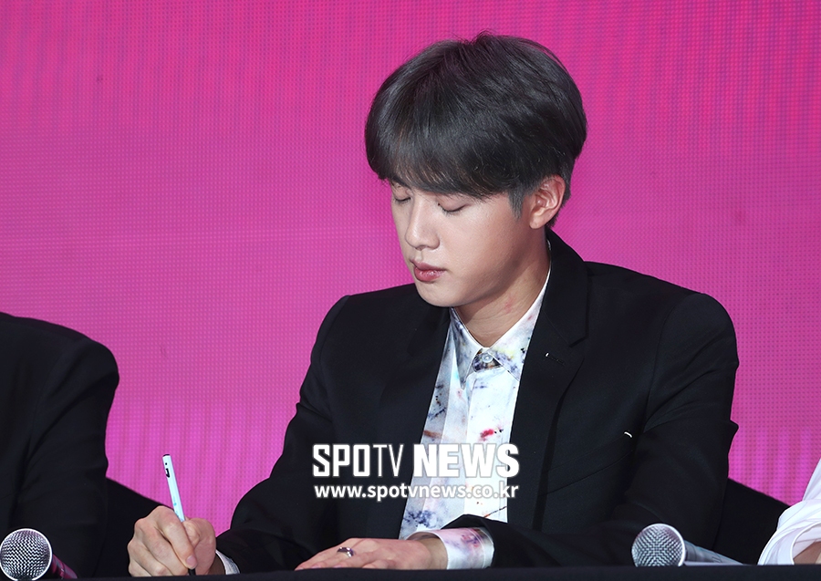 [스포티비뉴스=서울, 곽혜미 기자] 방탄소년단 'MAP OF THE SOUL : PERSONA(맵 오브 더 소울 : 페르소나)' 발매 기념 글로벌 기자 간담회가 17일 오전 서울 중구 동대문디자인플라자에서 열렸다. 방탄소년단 진이 취재진의 질문을 적고 있다.