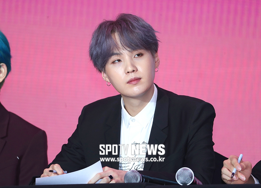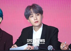 [스포티비뉴스=서울, 곽혜미 기자] 방탄소년단 'MAP OF THE SOUL : PERSONA(맵 오브 더 소울 : 페르소나)' 발매 기념 글로벌 기자 간담회가 17일 오전 서울 중구 동대문디자인플라자에서 열렸다. 방탄소년단 슈가가 펜을 들고 취재진을 바라보고 있다.