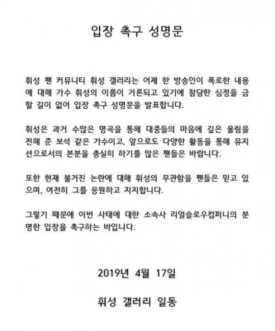 오히려 입을 연 쪽은 그의 팬덤이었다. 디시인사이드 휘성 갤러리 팬연합 측은 17일 A씨로 거론되고 있기에 참담한 심정을 금할 길이 없다며 입장 촉구 성명문을 발표했다. 휘성이 현재 불거진 논란에 대해 무관함을 팬들은 믿고 있으며 여전히 그를 응원하고 지지한다고 말했다. 그러면서 휘성 소속사 측에게 입장을 밝혀달라고 촉구했다.