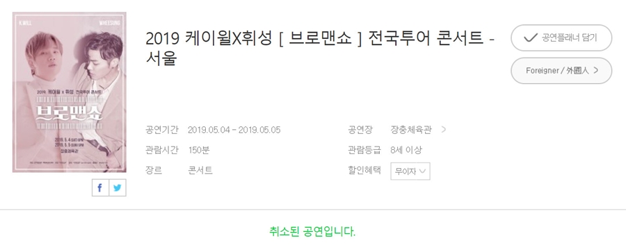 휘성과 케이윌이 참여하는 '브로맨쇼' 전국투어 콘서트 제작사 스프링이엔티는 17일 오후 멜론티켓 예매 페이지에 "오는 5월 4일, 5월 5일 서울을 시작으로 전주, 부산, 대구에 예정돼있던 2019 케이윌X휘성 브로맨쇼 전국투어 콘서트가 부득이한 사정으로 인해 취소됐다"고 밝혔다.