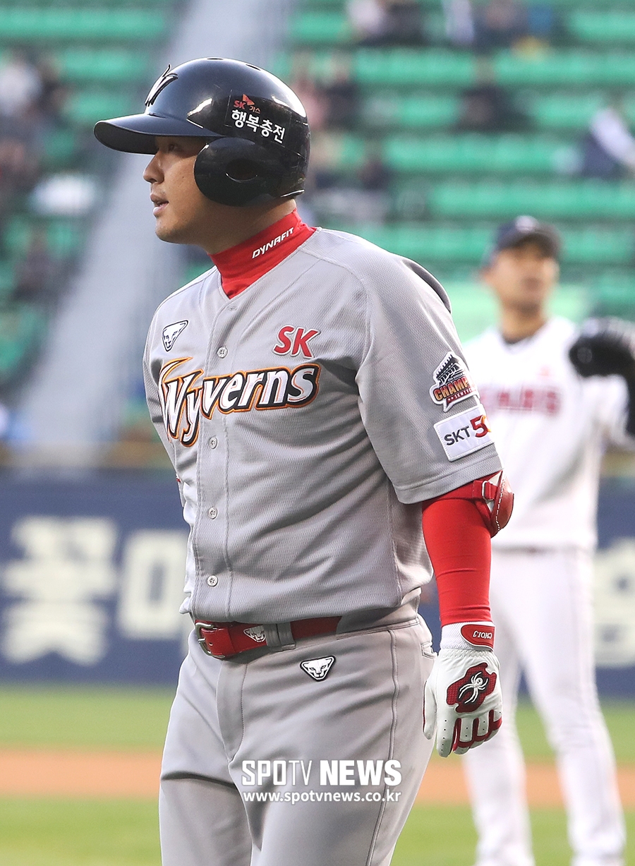 [스포티비뉴스=잠실, 곽혜미 기자] 2019 신한은행 MY CAR KBO리그 두산 베어스와 SK 와이번스의 경기가 17일 오후 서울 잠실야구장에서 열렸다. 1회초 1사 1루 포스 스트라이크 낫 아웃을 당한 SK 최정이 아쉬워하고 있다.