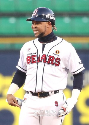 [스포티비뉴스=잠실, 곽혜미 기자] 2019 신한은행 MY CAR KBO리그 두산 베어스와 SK 와이번스의 경기가 17일 오후 서울 잠실야구장에서 열렸다. 1회말 무사 1루 상황에서 2루타를 날린 두산 페르난데스가 미소를 짓고 있다.