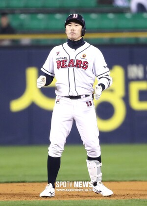 [스포티비뉴스=잠실, 곽혜미 기자] 2019 신한은행 MY CAR KBO리그 두산 베어스와 SK 와이번스의 경기가 17일 오후 서울 잠실야구장에서 열렸다. 6회말 1사 만루 상황에서 두산 허경민이 2타점 적시타를 날리고 기뻐하고 있다.