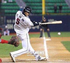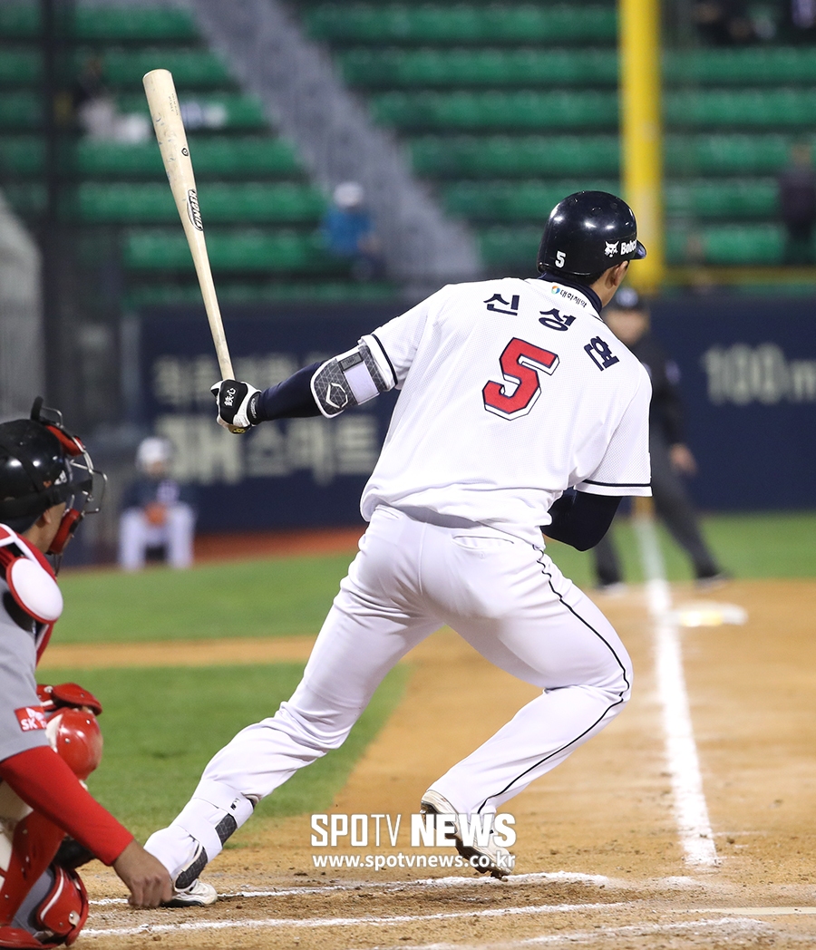 [스포티비뉴스=잠실, 곽혜미 기자] 2019 신한은행 MY CAR KBO리그 두산 베어스와 SK 와이번스의 경기가 17일 오후 서울 잠실야구장에서 열렸다. 6회말 2사 2루 상황에서 두산 신성현이 타격을 하고 있다. SK 3루수 최정의 실책으로 출루.
