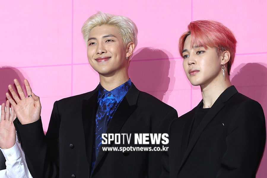 [스포티비뉴스=서울, 곽혜미 기자] 방탄소년단 'MAP OF THE SOUL : PERSONA(맵 오브 더 소울 : 페르소나)' 발매 기념 글로벌 기자 간담회가 17일 오전 서울 중구 동대문디자인플라자에서 열렸다. 방탄소년단 RM, 지민이 포즈를 취하고 있다.