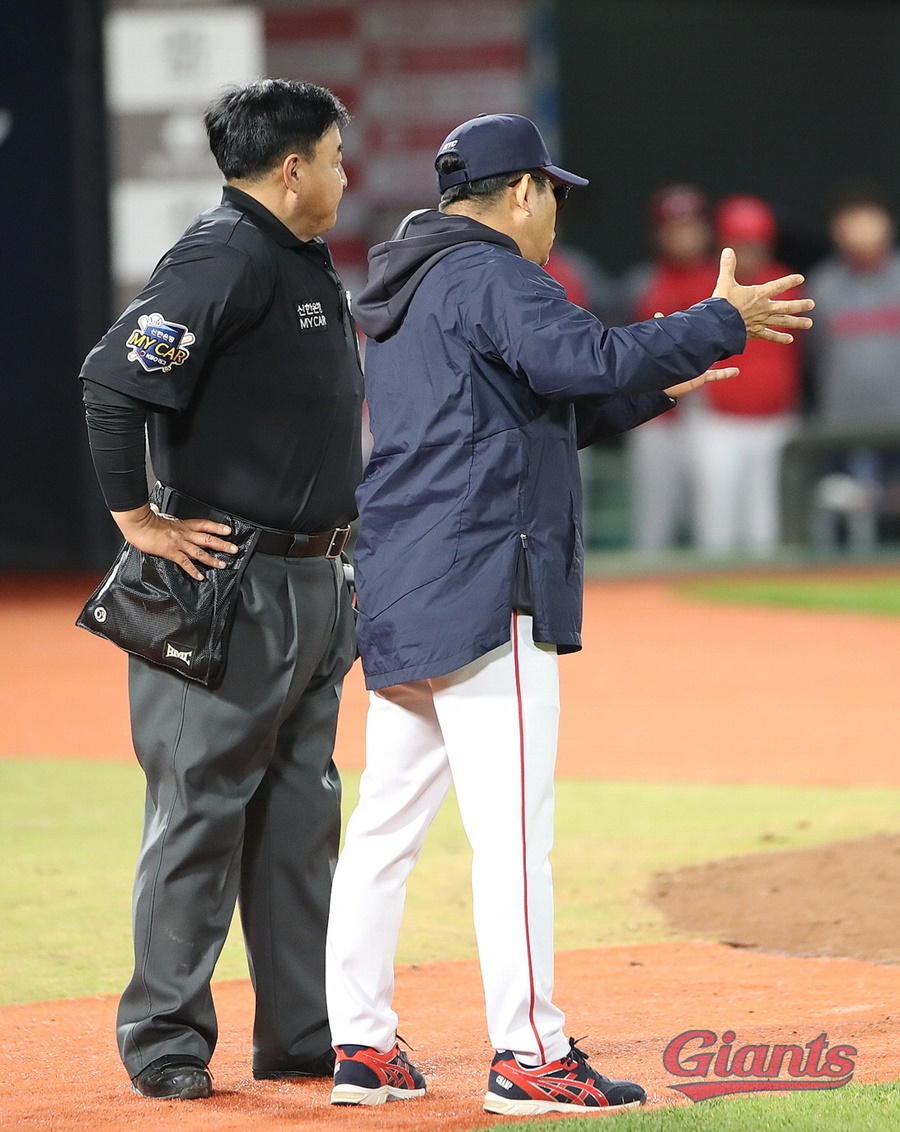 1사 1루에서 이대호의 좌중간 2루타에 손아섭이 홈에 들어오다가 아웃되자 양 감독은 비디오 판독을 요청했다. 포수 한승택이 홈플레이트를 막고 있어 '홈 충돌 방지 규정을 위반한 것이 아니느냐'는 이유였다.