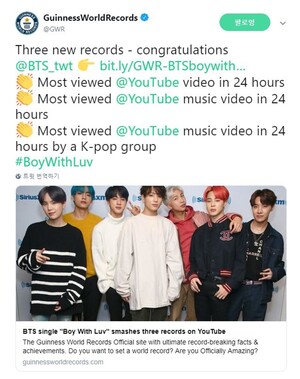 기네스 월드 레코드 측은 “미국의 싱어송라이터인 할시가 피처링에 참여한 ‘작은 것들을 위한 시’의 비디오는 공개 후 24시간 동안 7,460만 건의 조회수를 기록했다”며, "방탄소년단은 ‘24시간 동안 가장 많이 본 유튜브 비디오’, ‘24시간 동안 가장 많이 본 유튜브 뮤직비디오’, ‘케이팝 그룹 가운데 24시간 동안 가장 많이 본 유튜브 뮤직비디오’ 등의 타이틀로 기네스 세계 기록을 얻었다”고 소개했다.