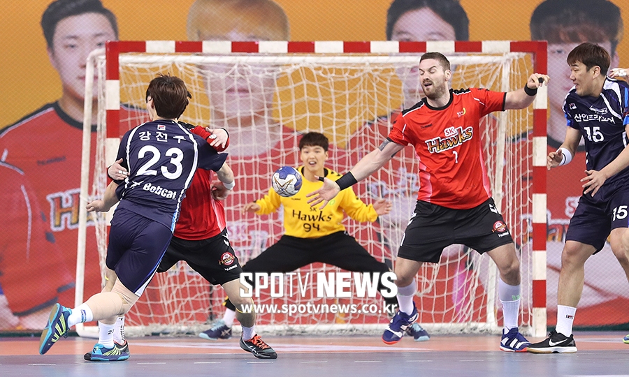 [스포티비뉴스=서울, 곽혜미 기자] 2018-2019 SK 핸드볼 코리아리그 남자부 두산과 SK의 챔피언결정전 1차전이 19일 오후 서울 송파구 올림픽공원 SK핸드볼경기장에서 열렸다. 두산 강전구가 골을 넣고 있다.