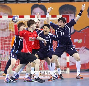 [스포티비뉴스=서울, 곽혜미 기자] 2018-2019 SK 핸드볼 코리아리그 남자부 두산과 SK의 챔피언결정전 1차전이 19일 오후 서울 송파구 올림픽공원 SK핸드볼경기장에서 열렸다. 두산 나승도가 블로킹을 시도하고 있다.