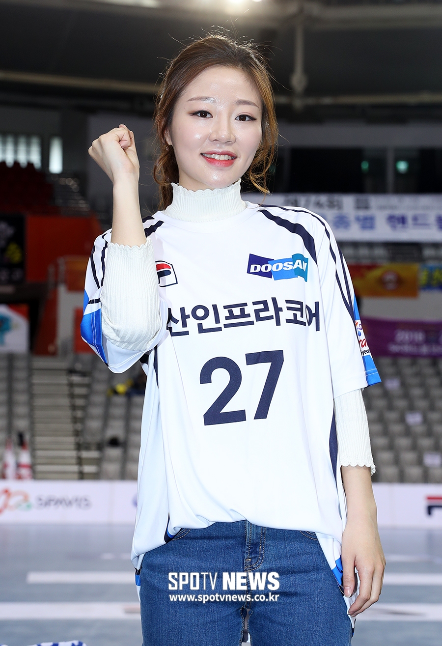 [스포티비뉴스=서울, 곽혜미 기자] 2018-2019 SK 핸드볼 코리아리그 남자부 두산과 SK의 챔피언결정전 1차전이 19일 오후 서울 송파구 올림픽공원 SK핸드볼경기장에서 열렸다. 핸드볼티비 박민희 리포터가 포즈를 취하고 있다.