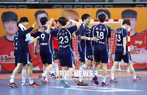[스포티비뉴스=서울, 곽혜미 기자] 2018-2019 SK 핸드볼 코리아리그 남자부 두산과 SK의 챔피언결정전 1차전이 19일 오후 서울 송파구 올림픽공원 SK핸드볼경기장에서 열렸다. 25-21로 승리한 두산 선수들이 기뻐하고 있다.