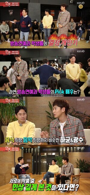 또한 김태진 리포터는 학생들을 향해 깜짝 인기투표를 하자고 권유했고 이광수와 신하균이 돌아선 가운데 학생들이 마음에 드는 배우 뒤에 서기로 했다.