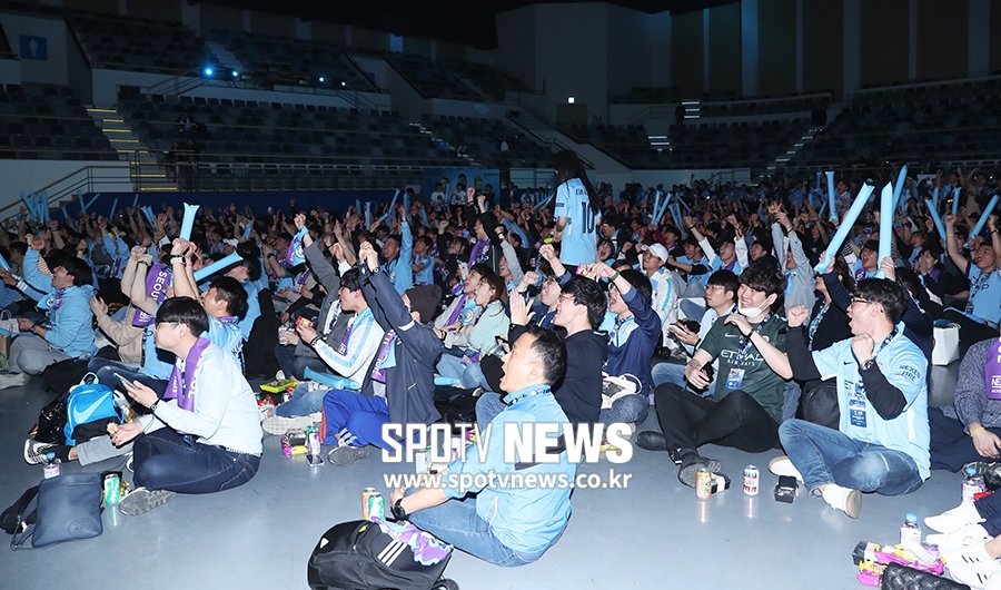 [스포티비뉴스=서울, 곽혜미 기자] 맨체스터시티 뷰잉 파티 '시티 라이브 서울'이 20일 오후 서울 강서구 화곡동 KBS 아레나홀에서 열렸다. 맨시티 필 포든의 선제골에 환호하는 팬들.