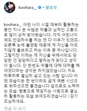 구하라는 "앞으로도 노력하는 모습, 행동으로 책임지는 사람으로 열심히 활동하는 모습 보여드리겠다"며 심경 글을 마무리했다.